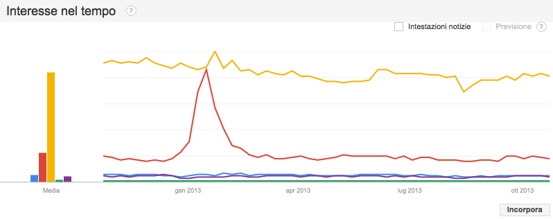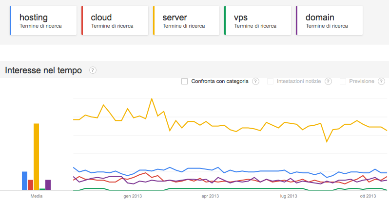 emerge un primo risultato che pone in prima posizione, in termini di interessi dei navigatori italiani della rete nell’ultimo anno, server come termine più cercato, mentre gli altri sembrano essere molto meno richiesti.
