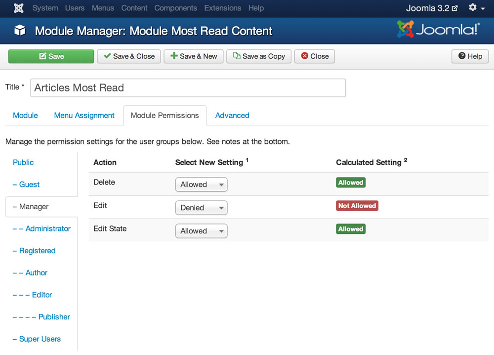 Nelle versioni precedenti di Joomla! la gestione degli ACL non permetteva, ad esempio, di modificare i permessi per articoli e categorie, ed era per questo motivo piuttosto limitata nel suo utilizzo. Con l’arrivo della 3.2 molte cose sono state migliorate e, su invito di un utente, ACL è diventato un vero e proprio modulo distinto: ACL Manager.