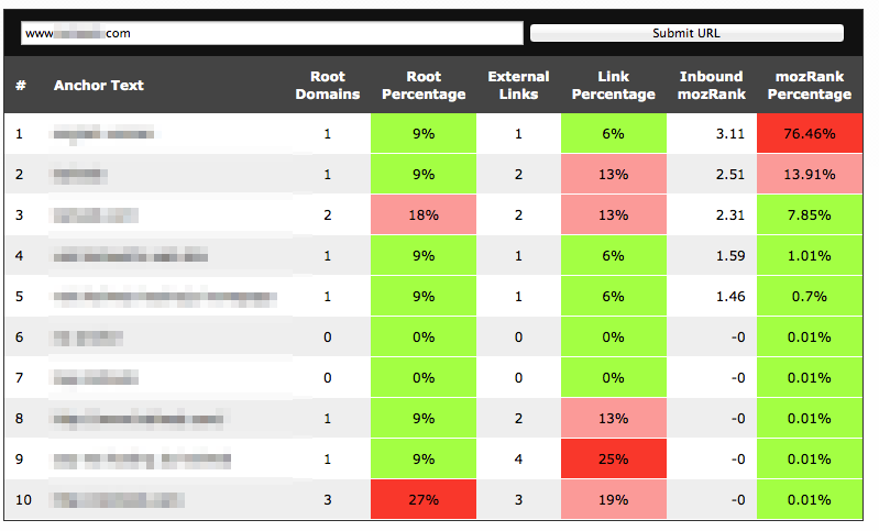 Fornisce un’analisi del sito in termini leggermente più specifici, ovvero relativi all’eventuale sovraottimizzazione delle ancore: se è vero che le anchor text in un certo senso “guidano” utenti e motori di ricerca per quanto riguarda il posizionamento, e lo influenzano in misura per la verità piuttosto indefinita, è bene preoccuparsi di un eccesso di backlink con la stessa chiave perchè potrebbero essere visti con sospetto da Google. Ovviamente non tutte le chiavi hanno la stessa importanza, ed esistono certamente eccezioni alla regola: in ogni caso è plausibile che la tabella di report che vi apparirà sia relativa solo ad un sottoinsieme di link rispetto a quelli totali. Il tool non può tenere conto, inoltre, degli eventuali link in disavow che avrete sottoposto.