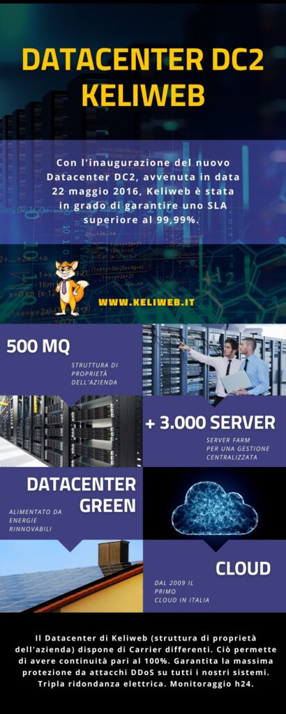 In merito alle caratteristiche tecniche del Datacenter Keliweb, abbiamo deciso di raccogliere le principali informazioni in un’infografica.