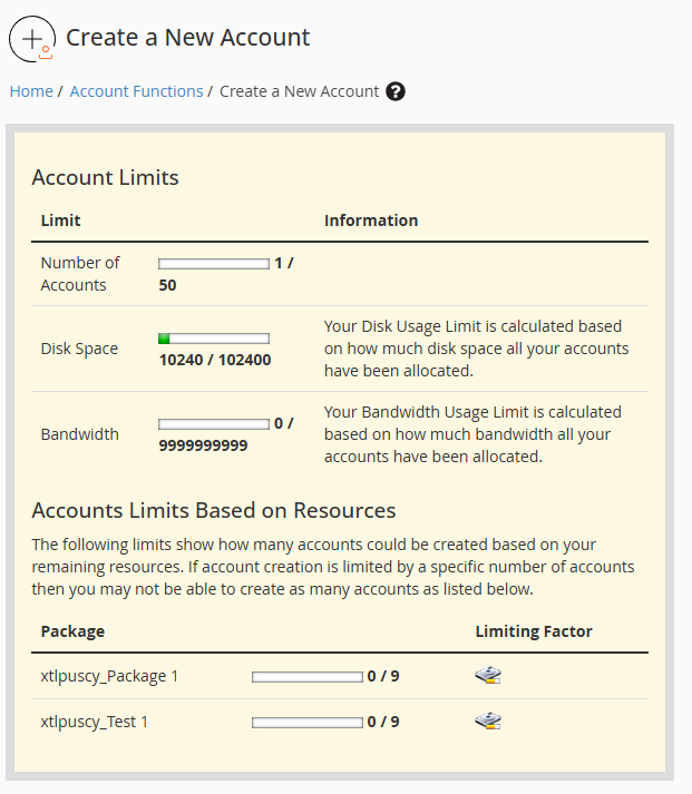 Come vedi nella figura che segue, qui puoi assegnare ogni singola risorsa per l’account hosting del tuo cliente. Questo è il dettaglio delle singole risorse che puoi assegnare ai tuoi clienti: